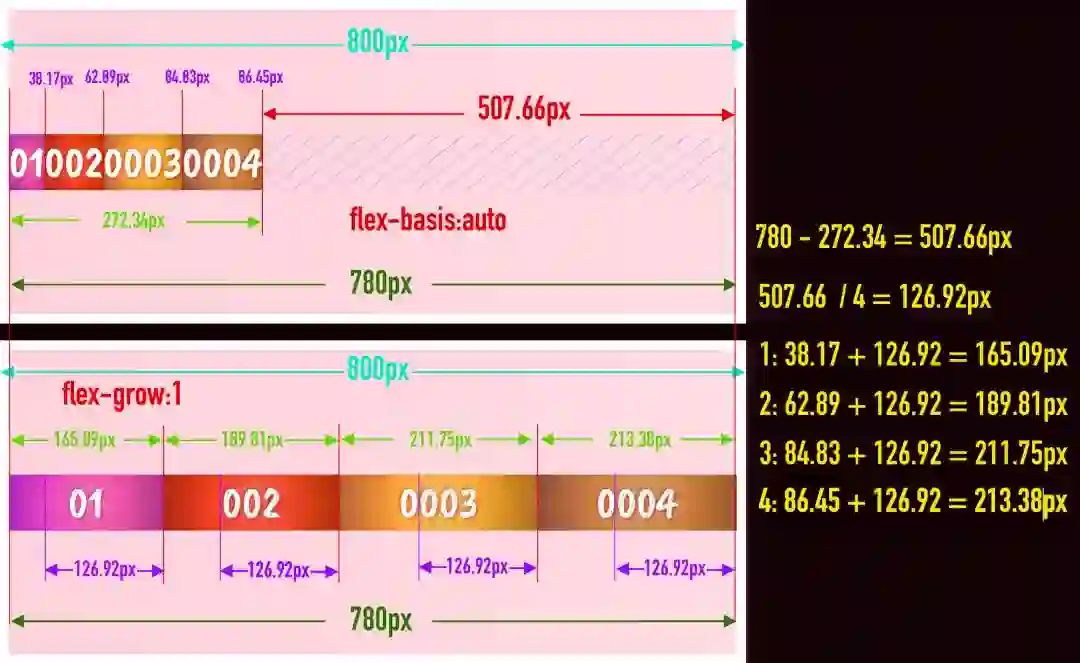 Flex项目伸缩计算是一个较为复杂的过程,但它们之间还是有据可查。@Chris和@Otree对该方面就有深入的研究。他们给Flex项目的计算总结出了一套计算公式,具体公式如下: