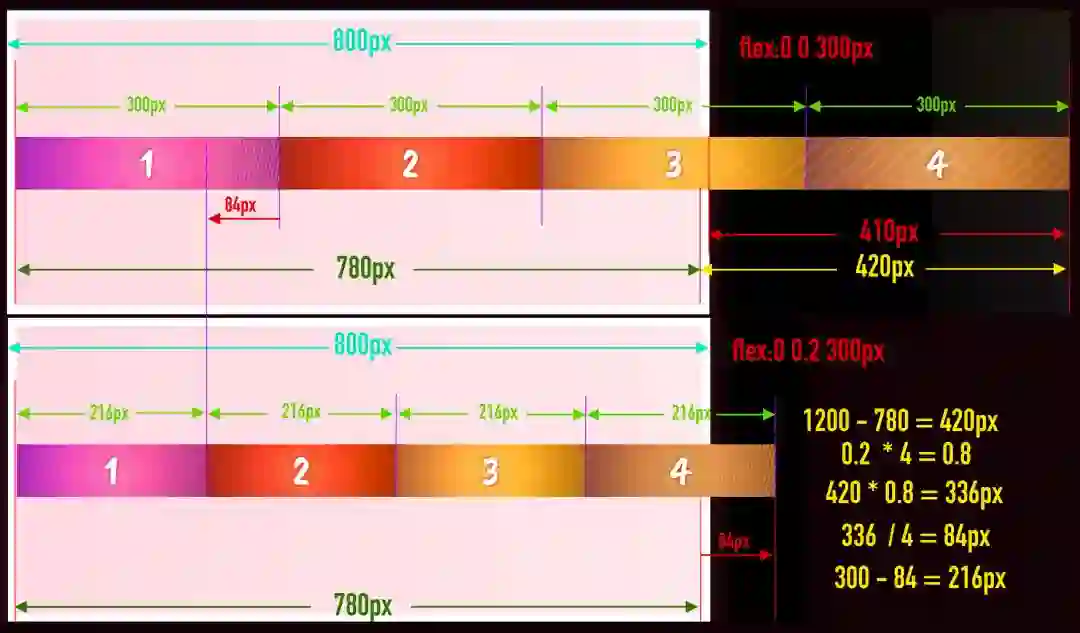 从结果的示例图中我们可以看出来,当所有Flex项目的收缩因子(flex-shrink)总和小于1时,Flex容器不足空间不会完全分配完,依旧会溢出Flex容器。好比该例,flex-shrink的总和是.8,分配了Flex容器剩余空间420px的80%,即336px(还有84px剩余空间未完全分配完),由于每个Flex项目的收缩因子是相同的,好比前面的示例,都设置了1类似,把分配的空间336px均分为四份,也就是84px,因此每个Flex项目的宽度由当初的300px变成了216px(300 - 84 = 216px)。这个其实和flex-grow类似,只不过flex-shrink只是收缩而以。