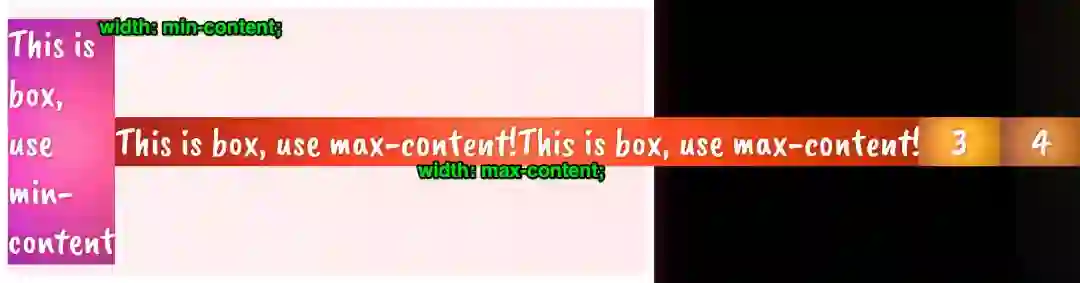 上例仅展示了min-content和max-content最基本的渲染效果(Chrome浏览器渲染行为)。这里不做深入的探讨论,毕竟不是本文的重点,如果感兴趣,欢迎关注后续的相关更新,或者先阅读@张鑫旭 老师写的一篇文章《理解CSS3 max/min-content及fit-content等width值》