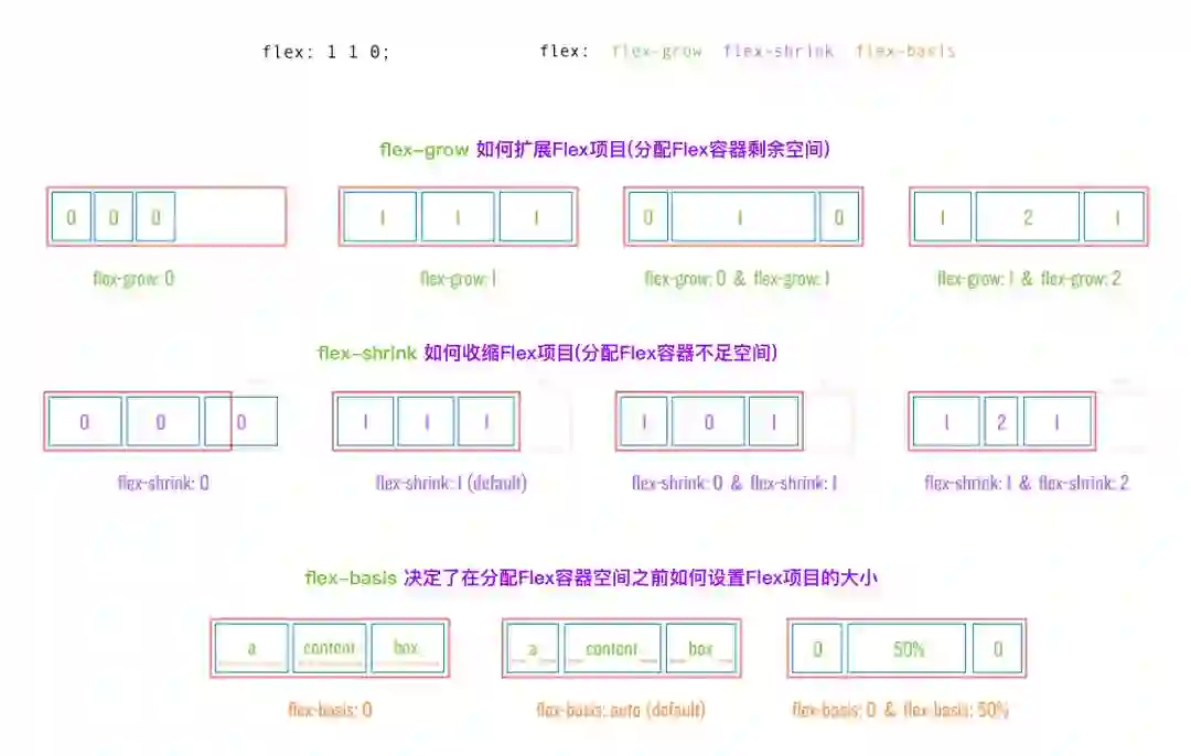 在Flexbox布局中,只有充分理解了这三个属性才能彻底的掌握Flex项目是如何扩展和收缩的,也才能更彻底的掌握Flexbox布局。因此掌握这三个属性,以及他们之间的计算关系才是掌握Flexbox布局的关键所在。