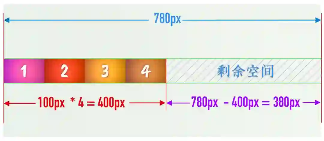 假设Flex容器中包含了四个Flex项目,而且每个Flex项目的width都为100px,那么所有Flex项目的宽度总和则是100px * 4 = 400px(Flex项目没有设置其他任何有关于盒模型的尺寸),那么Flex容器将会有剩余的空间出来,即780px - 400px = 380px。这个380px就是我们所说的Flex容器的剩余空间:
