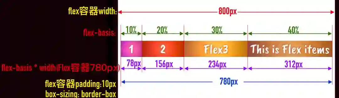 Flex容器显式设置了width(和box-sizing取值有关系,上图为border-box的示例结果),那么flex-basis会根据Flex容器的width计算出来,如果Flex容器未显示设置width值,则计算出来的结果将是未定义的(会自动根据Flex容器的宽度进行计算)。