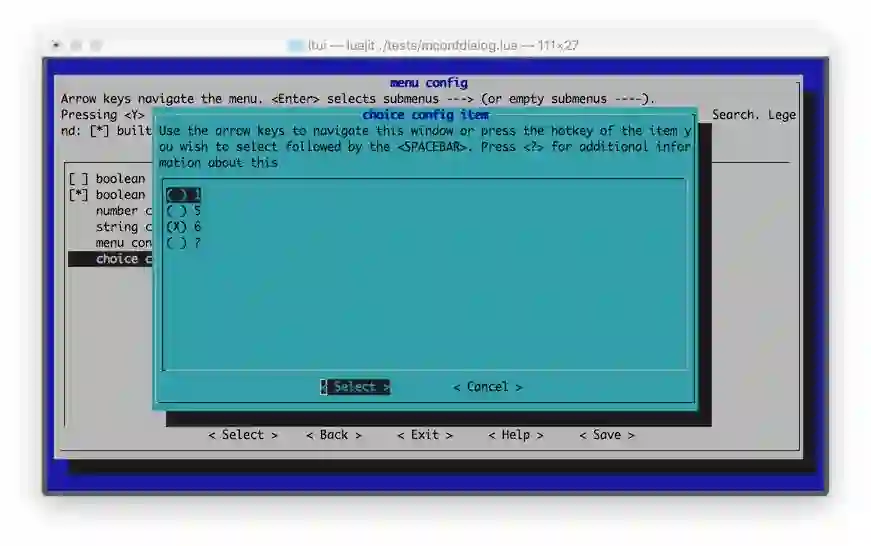 此框架源于 xmake 中图形化菜单配置的需求,类似 Linux Kernel 的 menuconf 去配置编译参数,因此基于 curses 和 lua 实现了一整套跨平台的字符终端 UI 库。而样式风格基本上完全参照的 kconfig-frontends,当然用户也可以自己定制不同的 UI 风格。