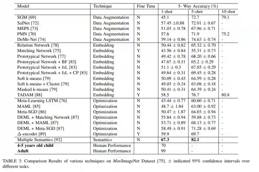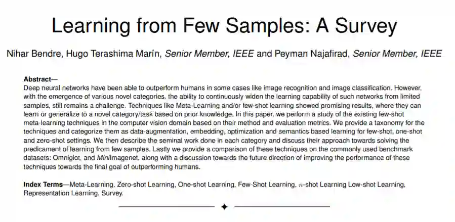 在图像识别和图像分类等方面,深度神经网络的表现已经超过了人类。然而,随着各种新类别的出现,如何从有限的样本中不断扩大此类网络的学习能力,仍然是一个挑战。像元学习和/或小样本学习这样的技术表现出了良好的效果,他们可以根据先验知识学习或归纳到一个新的类别/任务。在本文中,我们研究了计算机视觉领域中现有的小样本元学习技术的方法和评价指标。我们为这些技术提供了一个分类法,并将它们分类为数据增强、嵌入、优化和基于语义的学习,用于小样本、单样本和零样本设置。然后我们描述在每个类别中所做的重要工作,并讨论他们解决从少数样本中学习的困境的方法。最后,我们在常用的基准测试数据集Omniglot和MiniImagenet上比较了这些技术,并讨论了提高这些技术性能的未来方向,从而达到超越人类的最终目标。