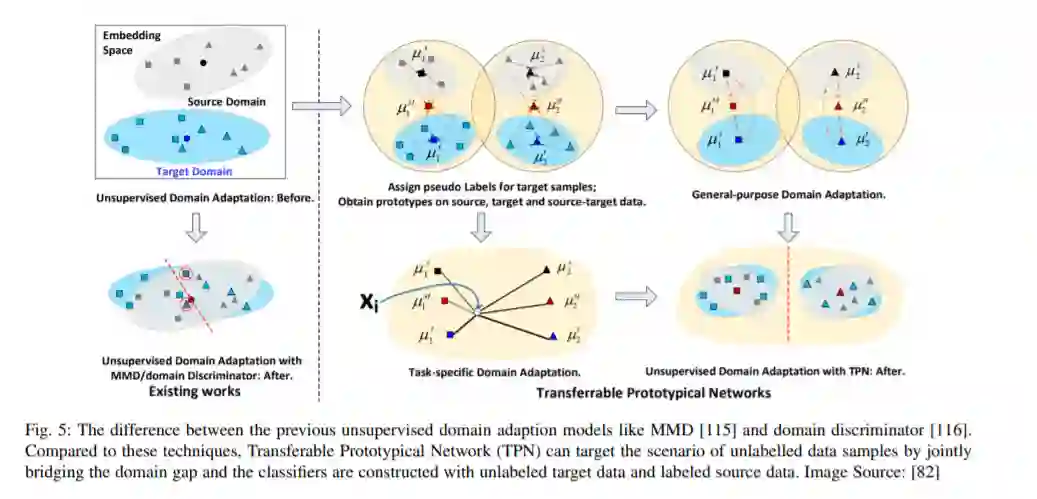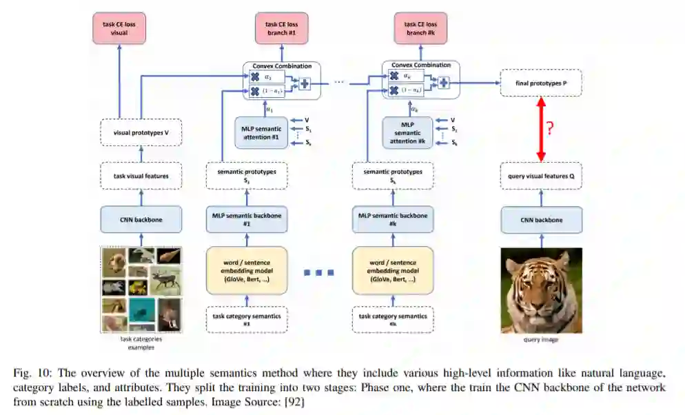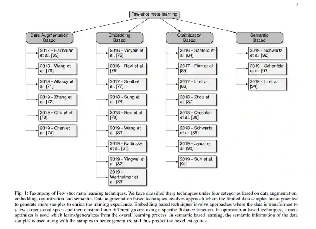 元学习领域的早期研究工作是Yoshua和Samy Bengio[67]以及Fei-Fei Li在less -shot learning[68]中完成的。度量学习是使用的较老的技术之一,其目标是从嵌入空间中学习。将图像转换为嵌入向量,特定类别的图像聚在一起,而不同类别的图像聚在一起比较远。另一种流行的方法是数据增强,从而在有限的可用样本中产生更多的样本。目前,基于语义的方法被广泛地研究,分类仅仅基于类别的名称及其属性。这种基于语义的方法是为了解决零样本学习应用的启发。