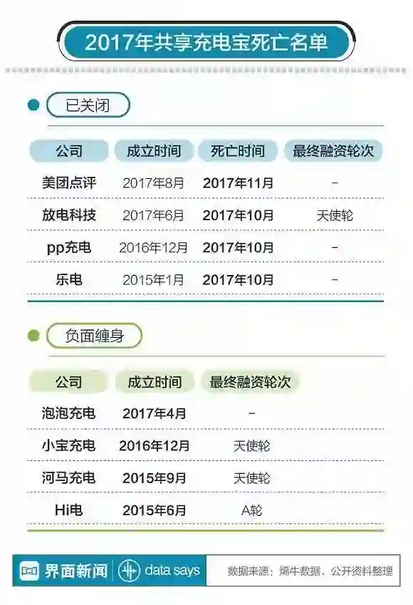 除了这些,据不完全统计,截至今年11月,已经出局或已处在项目清算阶段的还有:河马充电、小宝充电、创电、放电科技和泡泡充电。