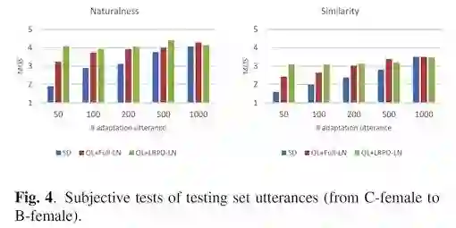 Fig. 4上对比了不同系统间的自然度和相似度。随着句子数的减少,SD系统的性能出现急剧下降,OL+LRPD-LN相比于SD和OL+Full-LN要更加稳定。与客观度量一致,在相同句子数下,OL+Full-LN和OL+LRPD-LN在性能上要优于SD。并且,OL+Full-LN和OL+LRPD-LN在200句话的性能和SD在1000句话时的性能相近。与客观度量不同,OL+LRPD-LN在500句以下的时候性能上就优于OL+Full-LN。这是因为过拟合导致合成出来的声音不稳定(虽然客观度量更优)声音的可懂度下降导致的。由此,我们依然可以得到相同的结论:当自适应句子数较少的时候,过拟合使得OL+Full-LN的性能变差。