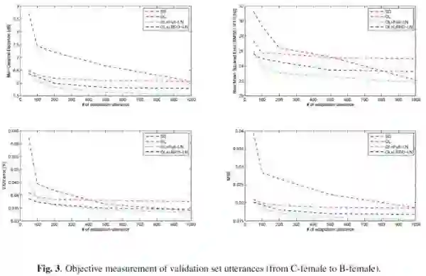 本文提出的算法,在中文数据集上进行实验,该数据集包含3个说话人,每个说话人有5000句话,时长约5h。数据集中语音的采样率为16k,特征提取中的窗长和窗移分别为25ms和5ms。分别用A-male、B- female和C-female来命名这三个说话人。本实验中,源说话人声学模型训练过程所使用的句子数为5000。为了对比不同句子数目下的合成效果,目标说话人的自适应数据集对应的句子数从50到1000不等。在自适应数据集之外,我们取200句话作为开发集,取20句话作为测试集(用于主观打分)。为了分析性别对自适应效果的影响,进行了三对源说话人-目标说话人之间的实验:女生-女生、男生-女生和女生-男生。另外,使用客观度量和主观测听两种方式来衡量模型的性能。客观度量主要包括:Mel-Cepstral Distortion (MCD)、root mean squared error (RMSE) of F0、unvoiced/voiced (U/V) prediction errors和开发集的MSE。主观测听主要是对系统合成的声音样本进行自然度和相似度上的打分——mean opinion score (MOS) 。