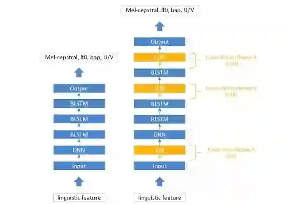 本文中,源说话人声学模型是一个基于多任务(multi-task)DNN-BLSTM的声学模型,见Fig. 1左侧。声学模型的输入为语音学特征,输出为声学特征。声学特征包括梅尔倒谱系数等。实验证明,在声学模型的底层使用深层神经网络(Deep Neural Network,DNN)可以获得更好的底层特征,并且收敛速度上相比于不使用DNN更快。在输出层上,不同的声学特征使用各自的输出层,它们仅共享声学模型的隐层。