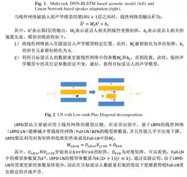 本文中,我们提出了基于线性网络(Linear Network, LN)的语音合成说话人自适应算法。该算法通过在源说话人声学模型的层间插入线性网络,然后利用目标说话人的数据来更新该线性网络和神经网络的输出层,从而能够获得属于目标说话人的声学模型。另外,一种基于低秩分解(low-rank plus diagonal,LRPD)的模型压缩算法被应用于线性网络。实验发现,当数据量较少的时候,通过LRPD来移除一些冗余的参数,从而能够使得系统合成的声音更加稳定。