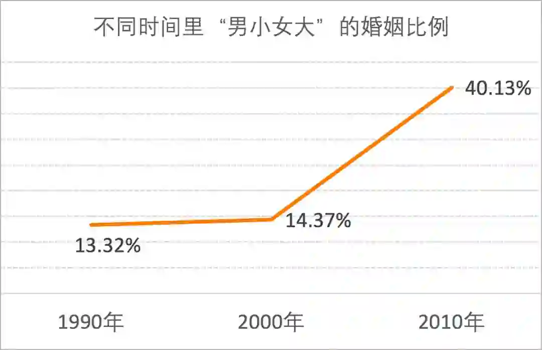 中国社科院研究员李春玲将1990年、2000年、2010年这三个时期作为节点,研究发现,1990年代,“男小女大”的婚姻占13.32%,2000年占14.37%。2010年后,“男小女大”的婚姻则上升到40.13%,与传统“男大女小”的婚姻模式分庭抗礼。在李春玲看来,“这是中国女性社会地位提高的表现”。