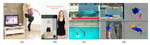 图 2 人体网格恢复的现实应用:(a)一款健身视频游戏(b) 虚拟试穿(c)3D+AI潜水教练系统(d)游泳过程中的动力学模拟