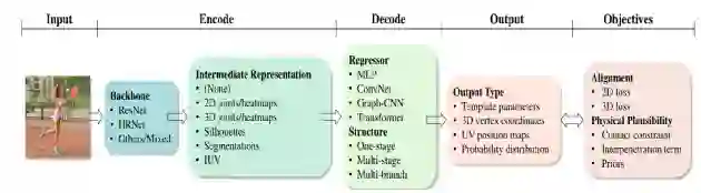 本综述主要关注深度学习时代的单目3D人体网格恢复方法(也称3D人体姿势和形状估计)。