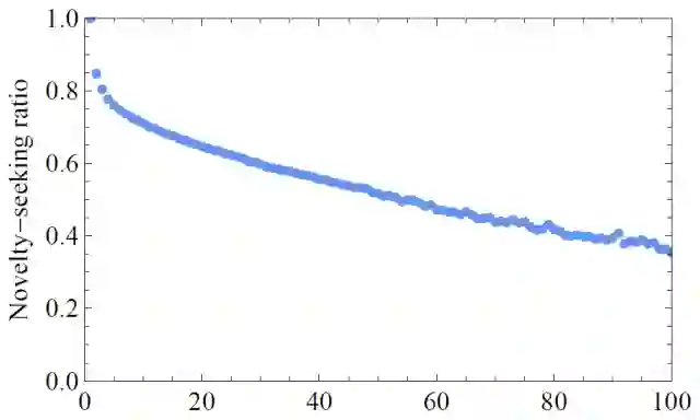 图3 该图统计了用户就餐次数和去新餐馆的概率,可以看到,即使一个用户在100次就餐之后,有接近40%的概率去一个新的餐馆就餐