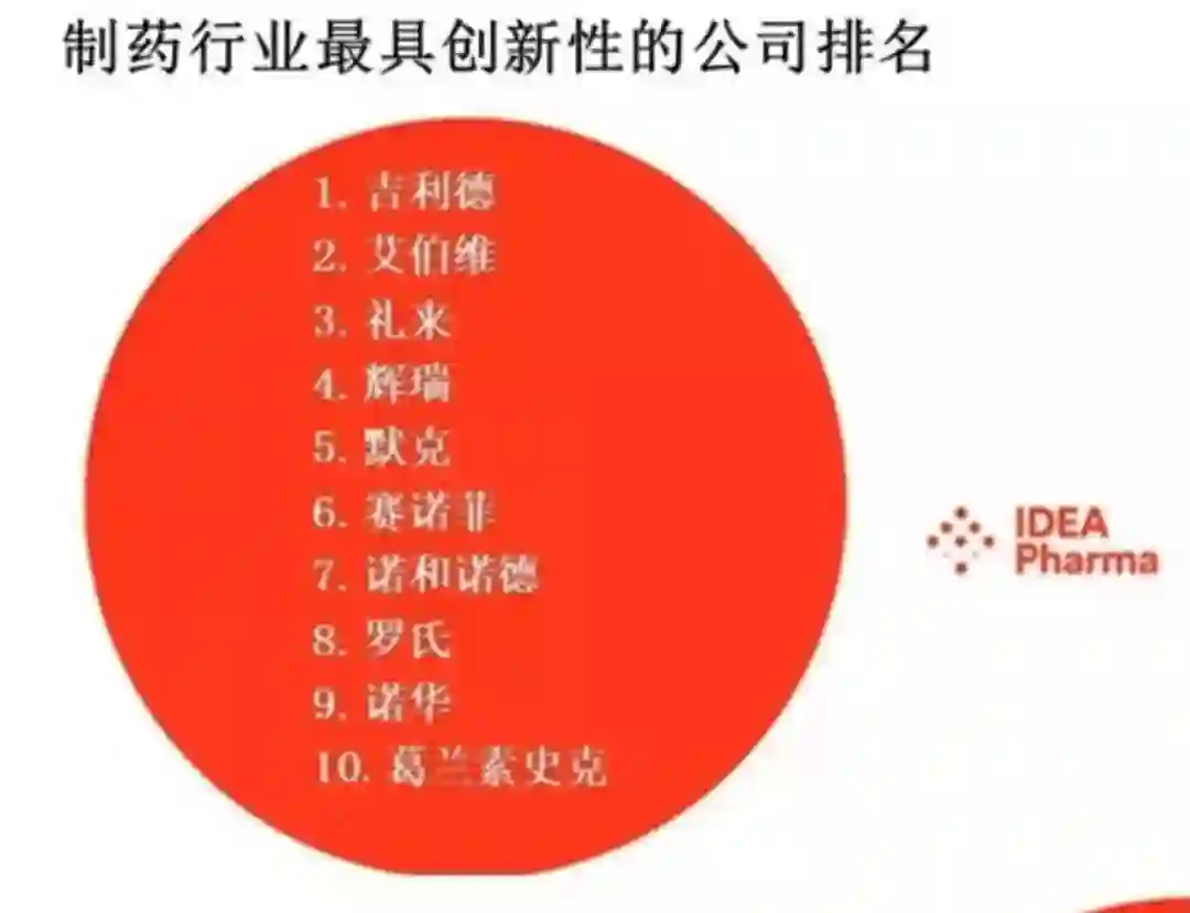 在IDEA Pharma评选的第九届(2019)年度药物创新指数排名榜上,吉利德击败了辉瑞、默克、罗氏等一批老牌医药巨头,荣登冠军宝座(下图)。