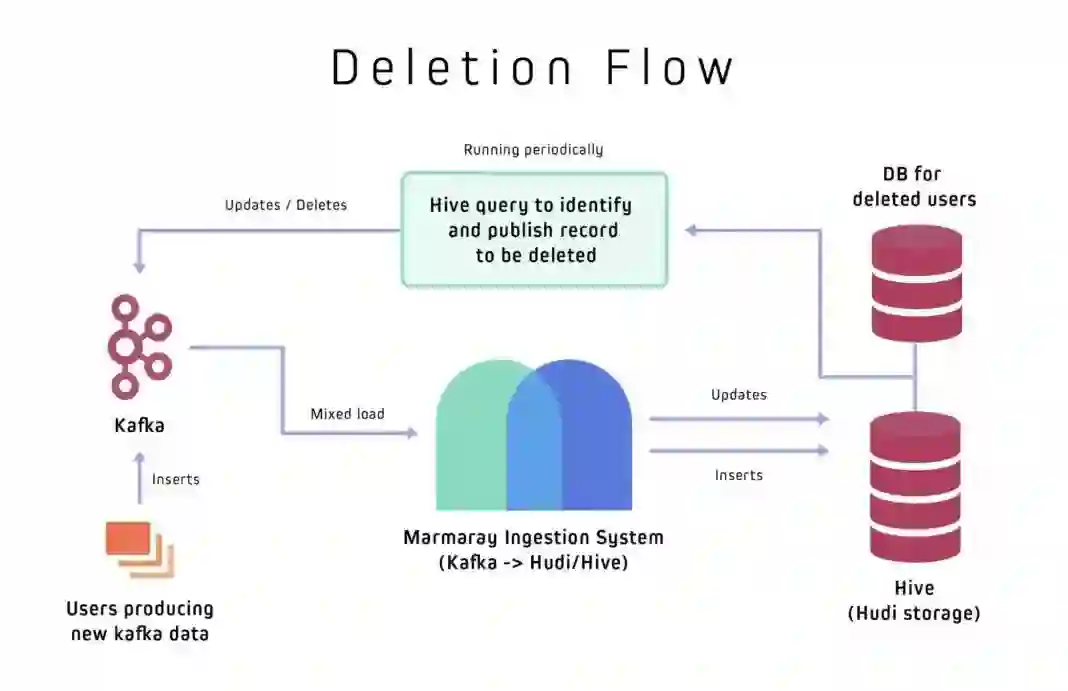 数据生产者使用 Hive 来扫描数据表,识别要删除的记录,并将它们发布到 Kafka 集群。Marmaray 的 Kafka 摄取管道依次从 Kafka 集群中读取它们。然后,Marmaray 使用 Hudi 的批量插入功能摄取新记录,保持较低的摄取延迟,并使用 Hudi 的 upsert 功能处理更新的记录,将 Kafka 的旧记录替换为更新过的数据。