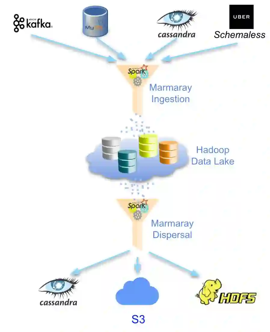 图 1:Marmaray 将数据摄取到 Hadoop 数据湖中,并分散到数据存储中。