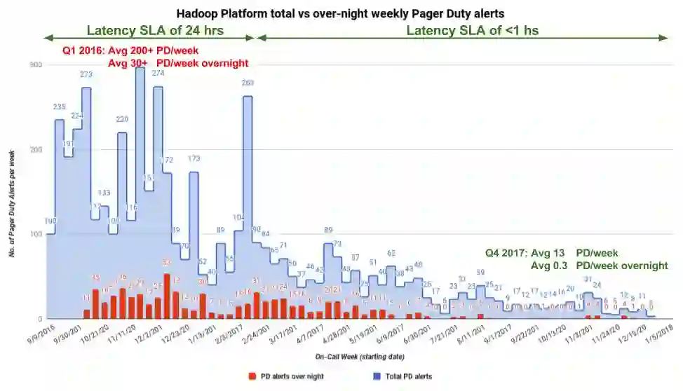 图 3:Hadoop 平台团队的轮班待命警报图表,可见维护系统需要多大的开销。