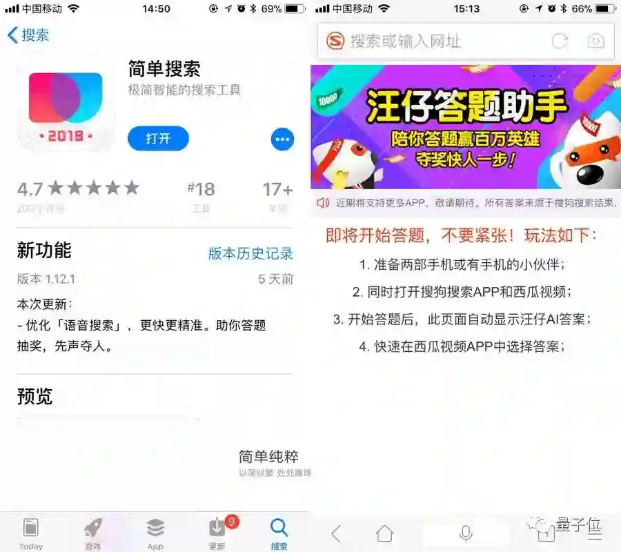 百度出品的简单搜索,在5天前更新的iOS 1.12.1版本中声称对“语音搜索”进行了优化,“助你答题抽奖,先声夺人”;