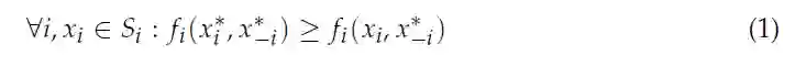 纳什均衡的正式定义如下。让 ( S, f ) 是一个有 n 个玩家的博弈,其中 Si 是给定玩家 i 的策略集。因此,由所有参与者的策略集组成的策略配置文件 S 将是,S=S1 × S2 × S3… × Sn。令 f(x)=(f1(x),…,fn(x)) 为策略集 x∈S 的支付函数。假设 xi 是参与者 i 的策略,x−i 是除参与者 i 之外的所有参与者的策略集。因此,当每个玩家 i∈1,…,n 选择策略 xi 时,策略集 x=(x1,…,xn),给特定玩家的收益 fi(x),这取决于该玩家选择的策略 (xi) 和其他玩家选择的策略 (xi-i)。如果任何单个参与者的策略单方面偏差都不会为该特定参与者带来更高的效用,则策略集 x∗∈S 处于纳什均衡[10]。正式地说,x∗ 处于纳什均衡当且仅当: