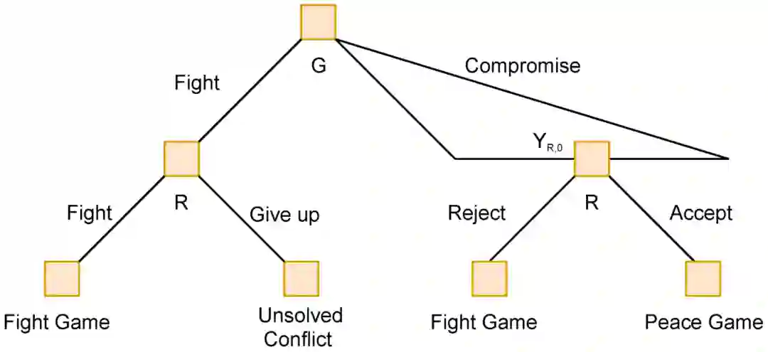 我们审查的下一篇论文是 Gries 等人[66] 这是对博弈论原理在游击战/破坏稳定战中的效用的全面调查。他们建模的重要因素是:破坏稳定的叛乱分子经常随机攻击,造成持续的威胁,必须有持续的缓解和检测策略;战争的持续时间很重要,并且会改变分配给目标和资产的价值;时间偏好在确定优先事项方面起着至关重要的作用,因为价值判断决定了战略决策,而战略决策又决定了成功或失败。他们提出的博弈模型既包括顺序非合作博弈,也包括同时非合作博弈,其中两个参与者分别是游击队和政府。对于这些冲突,经济和社会影响比军事损失和收益更重要,因此在计算结果价值方面发挥着更重要的作用。博弈特别模拟了双方试图寻求和平或与对方发生冲突的时刻。在这些时刻,政府军必须考虑每种选择的财务成本,而叛军则检查交战的优先顺序,以及他们将为每次交战提供多少战斗力。图 1 展示了从破坏稳定战争的这些时刻出现的决策树示例,其中 G 代表政府决策,R 代表叛军决策。