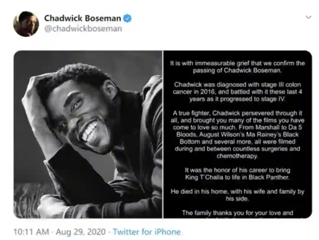 声明中写道,查德维克·博斯曼在2016年确诊结肠癌,四年来一直跟病魔作斗争。在这期间,他参与拍摄了《黑豹》《马歇尔》《誓血五人组》《复仇者联盟3、4》等电影,遗作为《Ma Rainey's Black Bottom》。这些作品都是在无数手术和化疗的间隙里完成的。