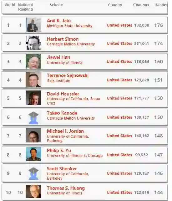 3. 排名第二高的华人是清华的数据科学研究院院长 Philip S. Yu(俞士纶)博士,h-index 是 147。另一位美籍华人、被誉为“计算机视觉之父”的Thomas S. Huang(黄煦涛)教授,排名第 10,h-index 为 144。