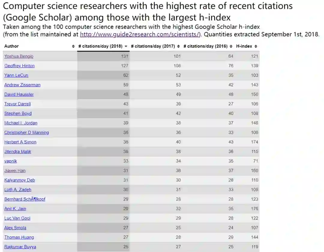 1. Yoshua Bengio,CIFAR机器学习项目的联合主任,同时也是蒙特利尔大学计算机与运算系的教授,数据学习算法中心的加拿大研究主席, 2018年单天论文引用平均次数131次,H-index达到121.