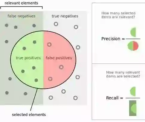 精确率(Precision)的定义在上图可以看出,是绿色半圆除以红色绿色组成的圆。严格的数学定义如下: