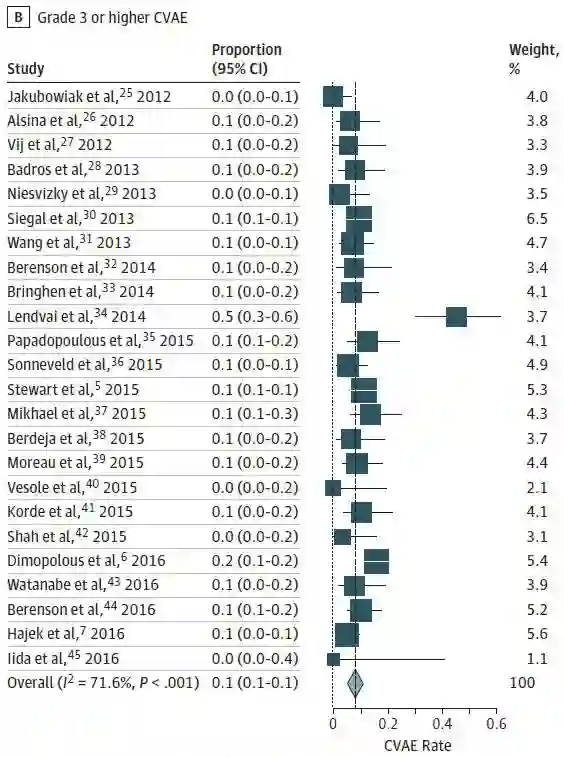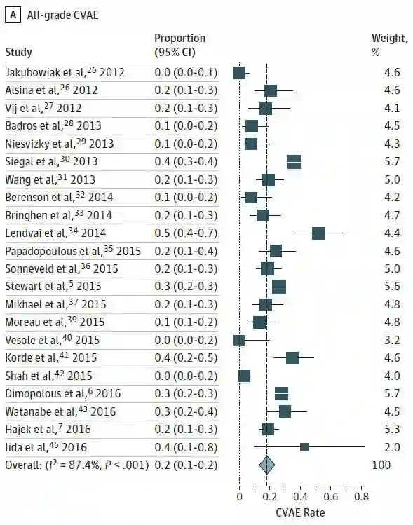 总体心血管不良事件CVAE发生率为0%-52%,>=3级CVAE发生率为0%-45%。采用随机效应模型进行META分析合并数据后,所有级别CVAE发生率和>=3级CVAE发生率分别为18.1%和8.2%。