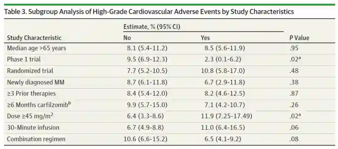 表 3 按研究特征对高等级心血管不良事件进行亚组分析