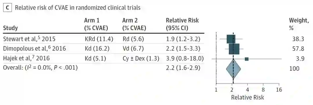 为了评估卡非佐米相关CVAE与CVAE在其他相同对照组中的相对风险,本研究计算了3个重要随机对照临床试验中发生CVAE的相对风险。纳入以下3项研究::ASPIRE(卡非佐米+来那度胺+地塞米松VS来那度胺+地塞米松),ENDEAVOR(卡非佐米+地塞米松VS 硼替佐米+地塞米松)和FOCUS(卡非佐米+地塞米松VS 地塞米松联合或不联合环磷酰胺)。所有3项试验均为高质量试验,遵循CONSORT2010指南。结果显示接受卡非佐米治疗的患者者高级别CVAE风险增加2倍以上(Summary RR = 2.2,95%CI = 1.6-2.9,P<0.001; I2 = 0%)。