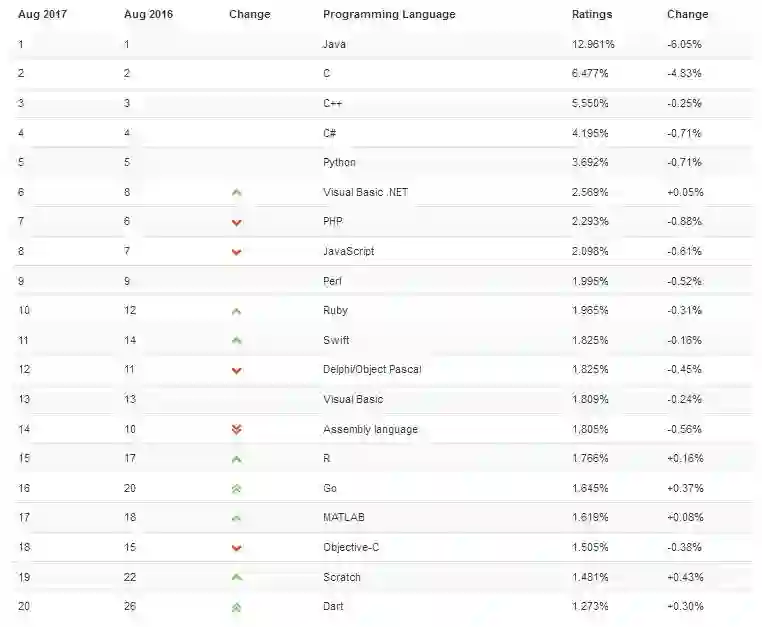 只见过“被死亡”和“被复活”了无数次的依然稳坐榜首的 —— Java 。今年以来,一些比较流行的语言都呈现出稳定下降的趋势,像 Java 和 C 语言就是其中的大代表。C 语言去年底就被爆一蹶不振,Java 语言也一度陷入狗带风波,来看看TIOBE 8 月编程语言排行榜情况如何: