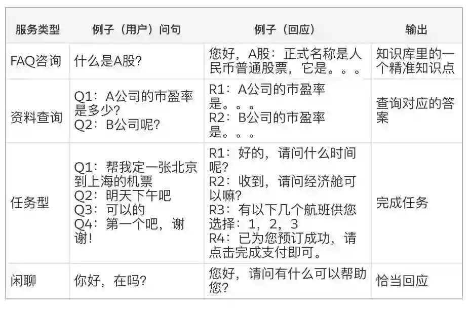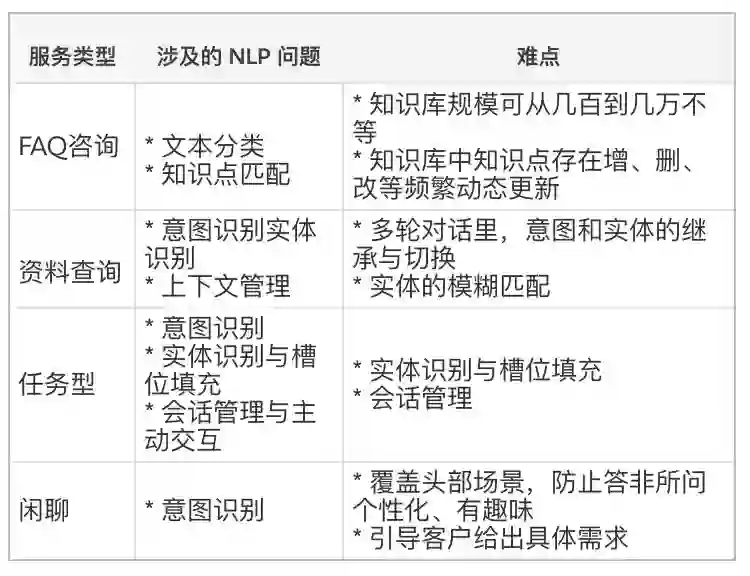 根据服务类型,对话机器人可以分为 FAQ 咨询、资料查询、任务型和闲聊四种,涉及的自然语言处理问题也各不相同。