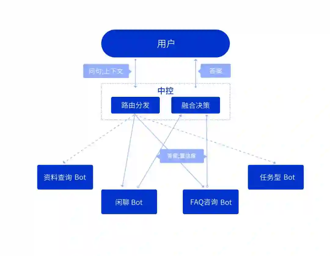 中控负责依据用户当前问句和历史会话记录,初步判断当前问题应该由哪个机器人来回答,然后下发给一个或多个下游机器人。下游机器人处理后,将答案以及对应的置信度返回给中控,中控根据下游返回的信息进行决策后,将最合适的响应返回给用户。