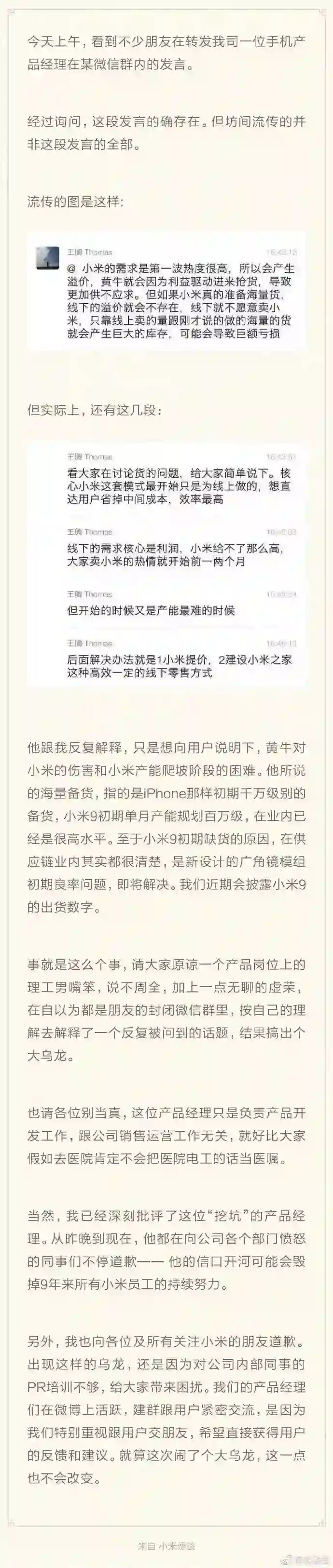 据报道,针对近日小米产品总监王腾在微信群聊中称“如果小米真的海量备货,则会导致线下不愿意卖小米,会导致巨额亏损”,小米集团公关部总经理徐洁云在微博回应称,王腾言论“只是想向用户说明黄牛对小米的伤害和小米产能爬坡阶段的困难”。