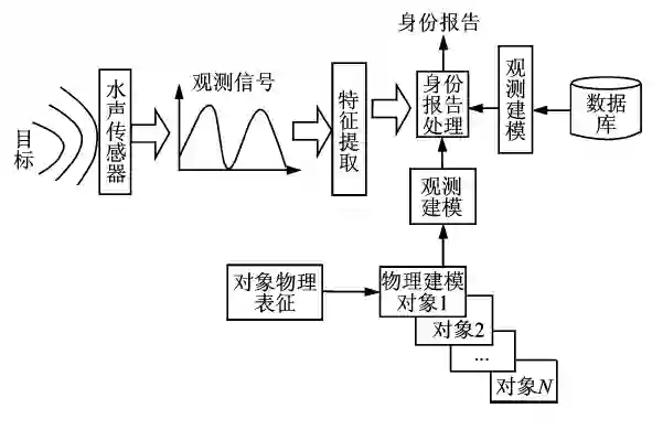 传感器观测目标并产生观测特征量,目标身份识别处理指将观测数据与数据库中存储的特征/模拟信号进行比对,包括过程预测与观测数据间的相关性处理,若相关系数>门限,则身份匹配成功。图1给出了物理建模的身份识别框架。物理建模复杂且计算量巨大,实时系统中应用受限,因此物理建模主要用于非实时系统研究。