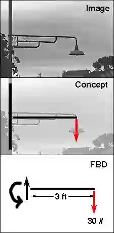 一个对现实生活中的路灯的梁进行受力分析的例子,忽略了它的重力因素,图片来自 [3]