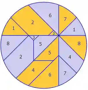 这个问题1967年的时候发表在《数学杂志》上,很快就有人针对切偶数刀的情形进行了计算,发现在这种情况下,两个人分到的披萨面积是相同的。下面我们来单独看一下关于切4刀时的巧妙证明。作者通过割补法就完成了对这个问题的巧妙证明。如图中编号所示,相同编号的两个图形是全等的。