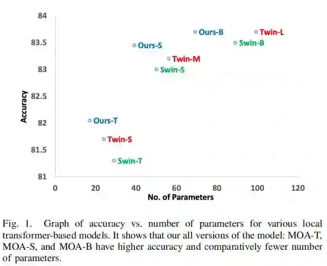 为了克服这些问题,作者开发了一个非常简单的模块,名为多分辨率重叠注意(MOA),以生成全局特征。该模块只包含乘法和加法运算,并在每个Stage后嵌入到下采样操作前的Transformer中。由于模块是在每一阶段后添加的,而不是在每一层Transformer后添加的,所以不会增加太多的计算量和参数数量。实验表明,将此模块的结果特征聚合到Local Transformer建立了长期依赖关系,因此与图1所示的参数总数相比,精度显著提高。