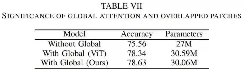 为了验证重叠和较大的key-value patches的效果,作者对没有重叠patches的模型进行训练并比较结果。此外,还进行了一个实验,在每个阶段之间不使用全局注意力来验证全局信息交换的意义。从表7的结果可以看出,包含全局注意力和重叠key-value patches的效果最好。