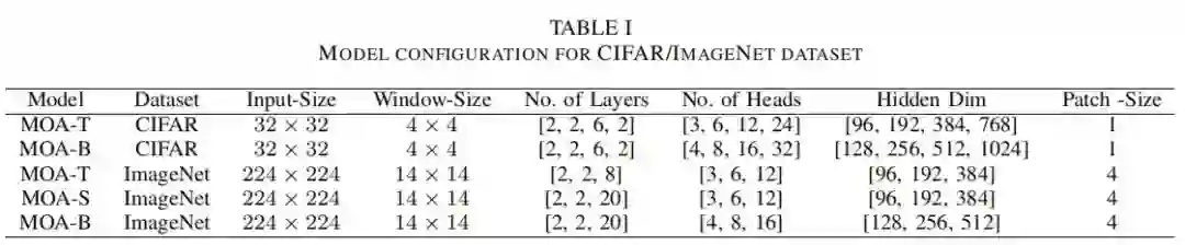 根据之前的工作,为ImageNet数据集构建了3个版本的模型:MOA-T、MOA-S和MOA-B,而为CIFAR -10/100数据集构建了2个版本的模型:MOAT和MOA-B,因为它非常小。