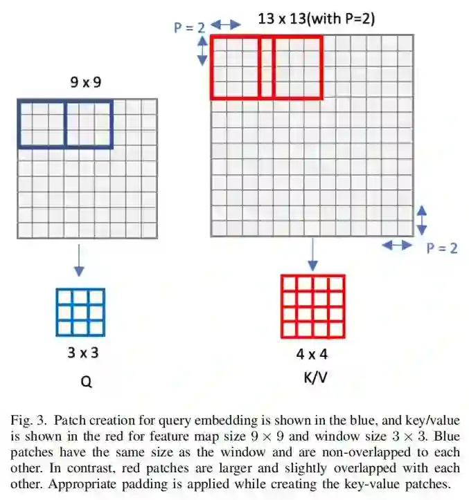 因此,首先利用1×1卷积来减少具有因子R的隐藏层维数,从而降低了计算成本。应用卷积后的特征维数为H×W×hiddendim/R。在一个query patch中特征大小为14×14×R被投影到一维向量的大小1×1×R。query的总数为H/14×W/14。类似地,投影key和value向量,但patch size略大于query,如图3所示。