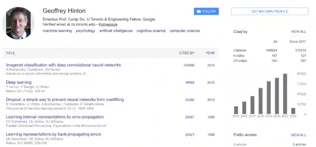 2012 年以来,AI 领域最火的是深度学习。这项价值数十亿美元的技术极大地推动了当代人工智能的发展。Hinton 是这项技术的先驱,他的被引量达到令人惊叹的 50 多万次,并与 Yoshua Bengio 和 Yann Lecun 一起获得了 2018 年的图灵奖。