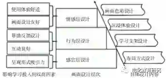 大量实验和设计实践证明,运用多媒体画面语言学的系统化设计思想进行资源画面设计,是非常科学、有效的。表2中,从多媒体画面语言的视角看,画面设计的五个因素属于多媒体画面语言学的语构层,并辐射影响画面语义层和画面语用层[5],是移动学习资源画面设计研究的核心范畴。伯恩德·H·施密特提出“感觉—情感—思考—行动—关联”的用户体验五环节,构筑用户的全面体验;侧重用户体验过程及与之伴随的情感与认知变化,用户在体验过程中伴随着认知与思考等高级思维加工过程而产生体验的跃迁[6]。用户体验设计师诺曼将设计分为本能层、行为层和反思层三个层次[7]。依据上述用户体验的设计思想,将影响学习投入的5个画面设计双高因素进行层次归类,结果见表3。