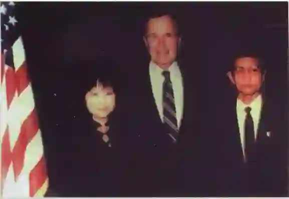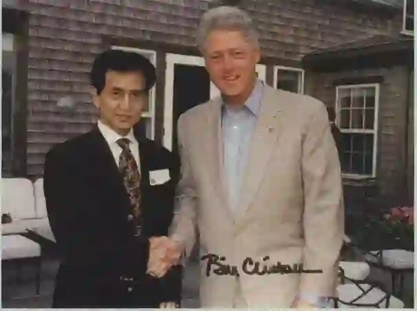 没多久,严大师还被请去美国讲课,跟美国总统克林顿、老布什合影。