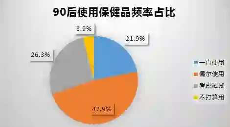 根据各大网购平台的数据显示,21.9%的90后长期使用保健品,47.9%的90后偶尔使用保健品。