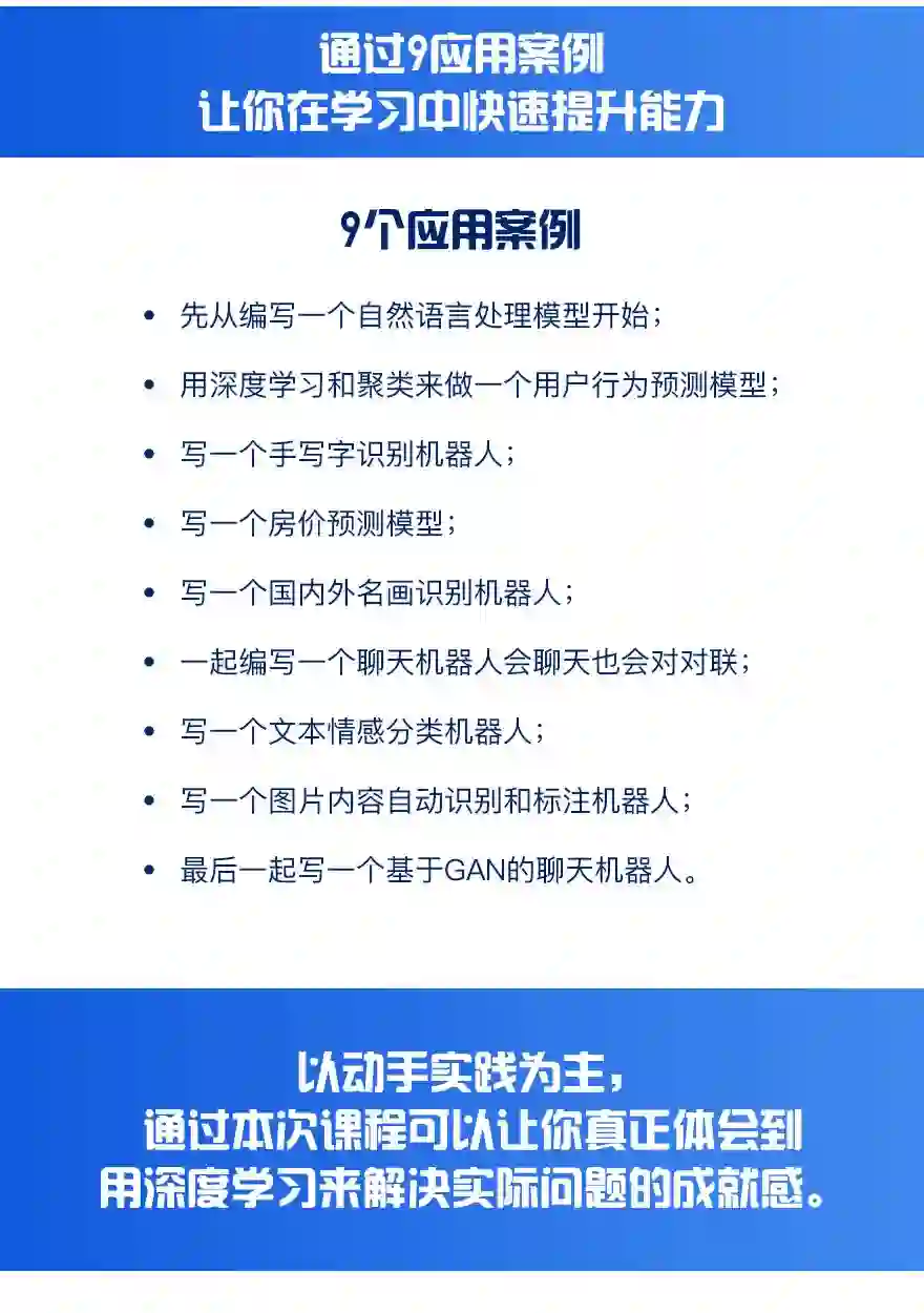 这门课程中,讲师选取了9个经典应用案例,手把手教你如何在 Tensorflow 上面实现,你将使用 Tensorflow 的高阶 API 接口所集成的很多算法和网络模型,快速实现应用场景中的具体问题,达到所用即所得的地步。