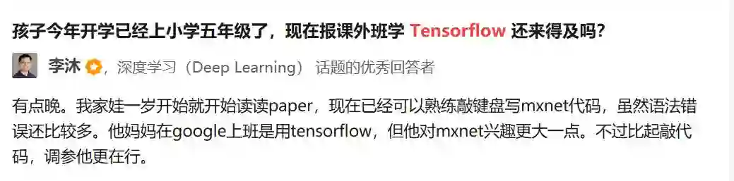 小学五年级报名课外班学 Tensorflow 晚不晚?答案是:晚了,毕业于上海交大和卡内基梅隆大学,现任亚马孙AWS主任科学家的李沐表示,他家的娃1岁就开始读paper,现在已经可以熟练的写mxnet代码了。