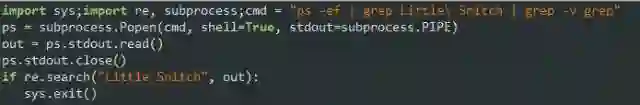 可以看到,这个python代码会检查是否“Little Snitch” 进程是否在执行(“Little Snitch”是一个针对mac OS 的防火墙设定服务 )。如果在执行,那么python代码会停止。如果未执行,那么它会向C&C服务器发送请求,捕捉另一段python代码。